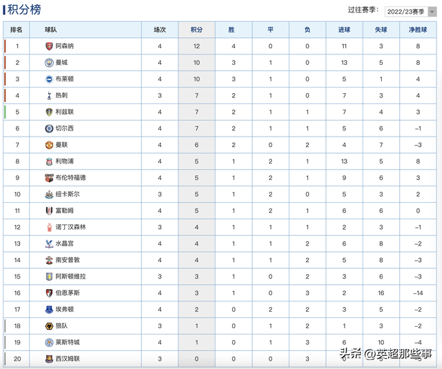 昨晚今晨,英超联赛第4轮进行了多场比赛,曼城主场4-2逆转水晶宫,哈兰德上演帽子戏法;利物浦主场9-0横扫伯恩茅斯,拿到赛季首胜,菲尔米诺贡献了2球3助;阿森纳主场2-1逆转富勒姆,豪取4连胜领跑;曼联客场1-0击败南安普顿,B费打进唯一入球;切尔西主场2-1击败莱斯特城,斯特林梅开二度!